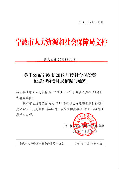 关于公布宁波市2018年度社会保险费征缴和待遇计发依据的通知 甬人社发〔2018〕53号