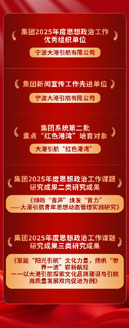 政研工作方面,宁波引航获评集团2025年度思想政治工作优秀组织奖,2篇政研论文《倾听“青声”焕发“青力”——大港引航青年思想动态管理实践研究》《聚能“阳光引航”文化力量,扬帆“世界一流”崭新航程——以大港引航探索文化品牌建设与引航高质量发展双向促进为例》分获集团优秀政工论文二、三等奖,并与另外16篇论文入选集团优秀政研论文集。2篇政研论文分别聚焦宁波引航青工群体的思想引导与实践和“阳光引航”行业品牌与引航发展联动,以思政工作结合实际应用,为党建引领下各项工作迸发硬核力量提供有力参考。