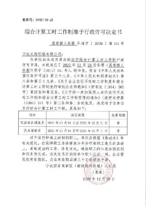 对《综合计算工时工作制准予行政许可决定书》的公示