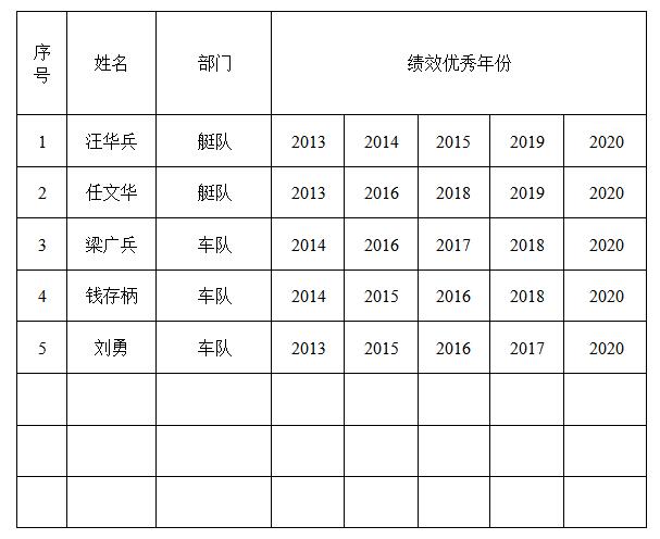 经公司绩效管理委员会审定,现将公司劳务用工2013年-2020年绩效优秀累计满五次人员名单公布如下: