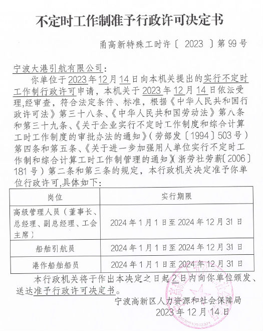 关于2023年宁波高新区人社局下发的《不定时工作制准予行政许可决定书》的公示