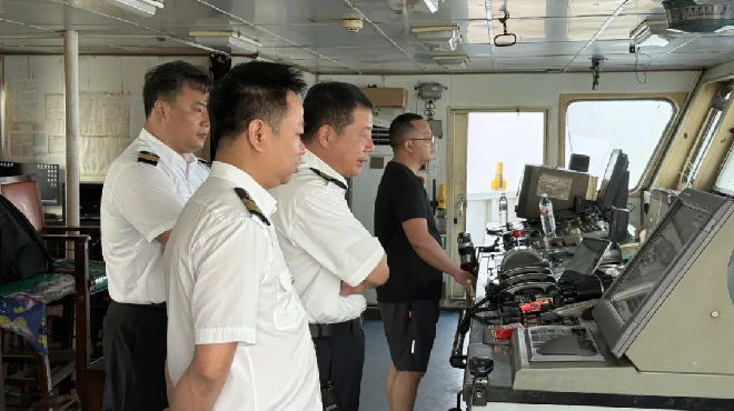 然而,拖带任务并不轻松,拖带船组操纵能力受限,还需面对狭窄水道、岛礁区潮流复杂、大潮汛影响、海上团雾等诸多危险因素挑战。宁波引航团队凭借精湛技术和丰富经验,通过巧妙使用拖轮、各成员合理分工、紧密配合,对无动力被拖带船进行精准控制,经过数小时努力,引航员们成功引领“齐合9”轮安全靠泊梅山码头。为提升效率,帮助船方及早进船厂修理,引航团队待货物卸载完毕后,又第一时间引领其出港。